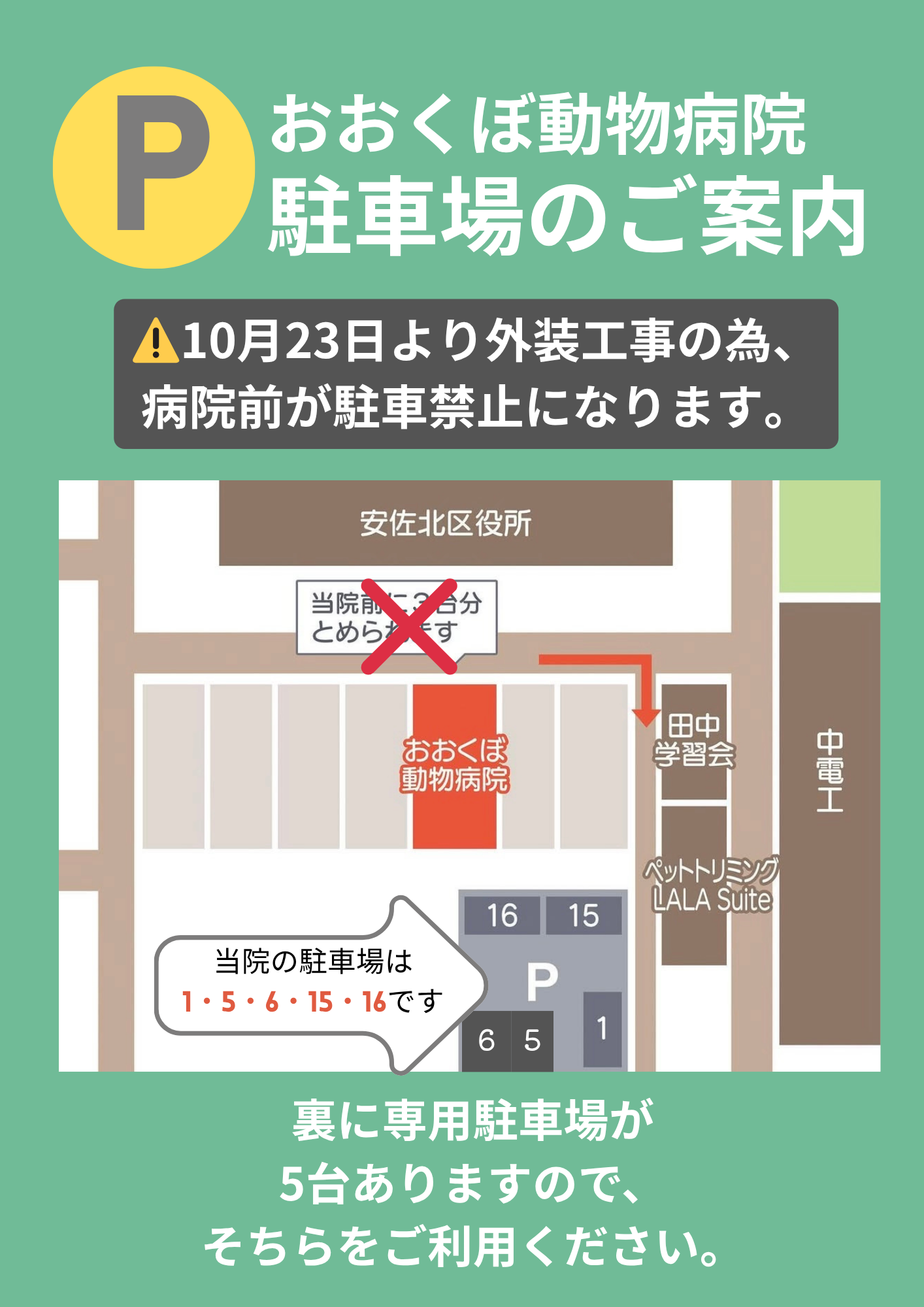 安全を確保する為、当院前の駐車場スペースが期間中は使用禁止となります。